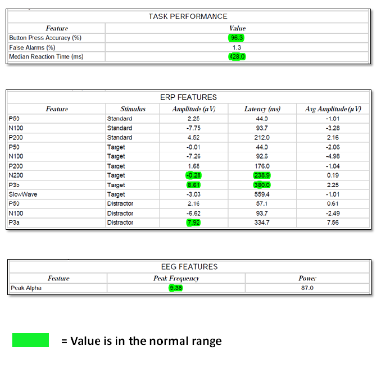 • P3b amplitude and latency from the target stimulus are good, reflecting normal