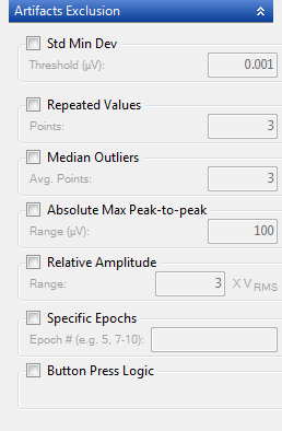 Controls what Artifacts are to be excluded from the display set. If an artifact is detected in any epoch on any channel, that epoch is excluded from all channels.